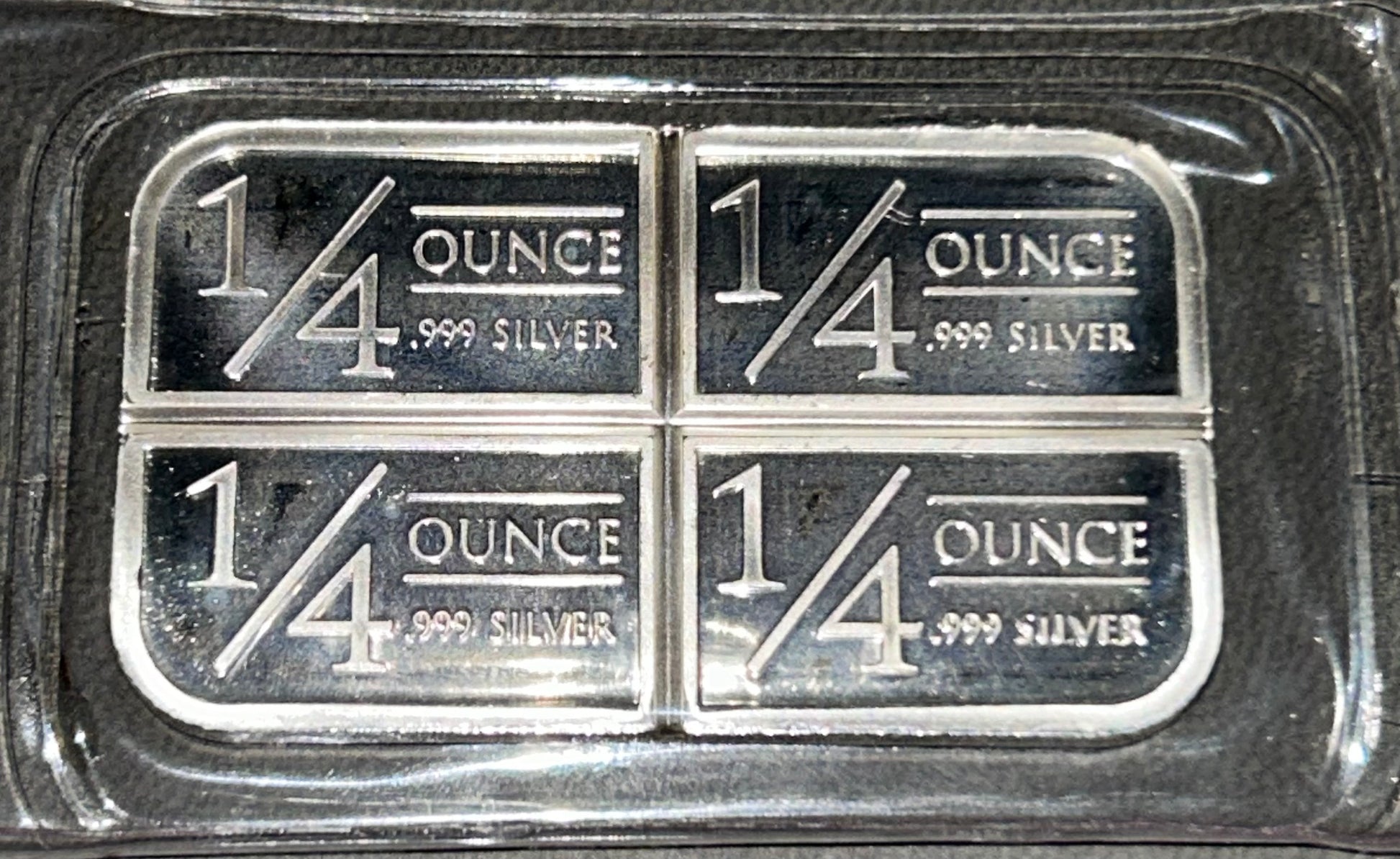 This 1 troy ounce .999 fine silver bar is composed of four individual 1/4 ounce fractional bars, designed to be easily broken apart along the pre-scored seams. Each fractional bar is clearly stamped “1/4 OUNCE .999 SILVER”, making this an excellent option for collectors, stackers, barter, or emergency silver.